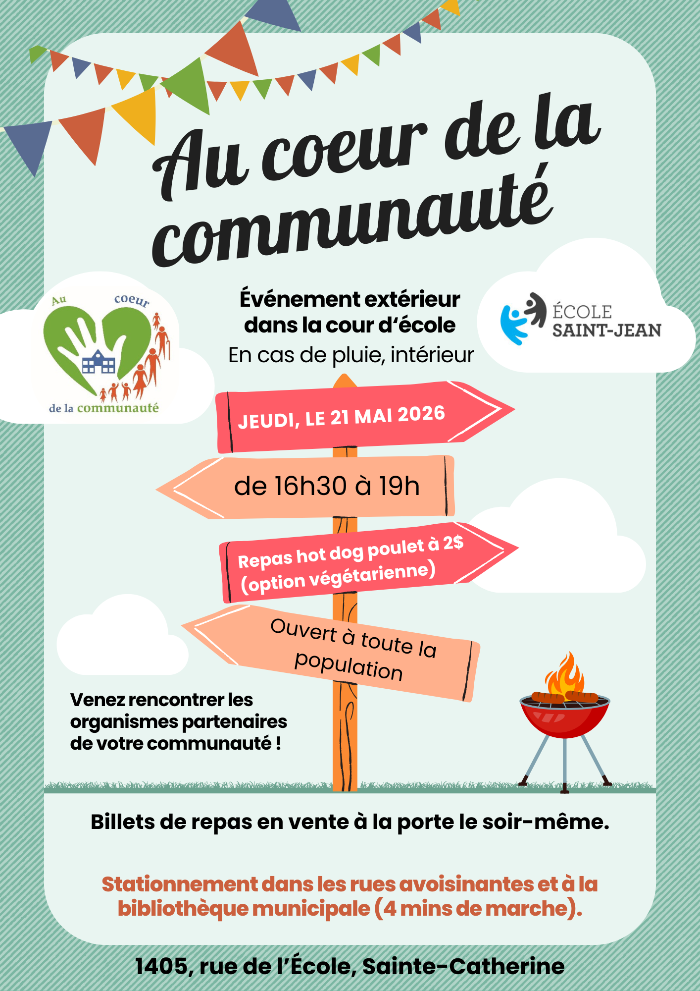 Au coeur de la communauté est un événement où toute la population est invitée à visiter les kiosques des organismes partenaires de la communauté dans l'école de quartier tout en prenant un repas hot dog (2) et crudités au coût de 2 $. Des activités ludiques sont animés par les ressources partenaires afin d'animer petits et grands et profiter de l'occasion pour passer un bon moment en famille tout en découvrant des ressources qui peuvent nous venir en aide.