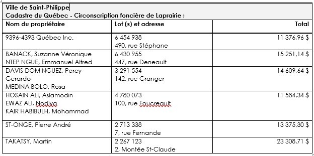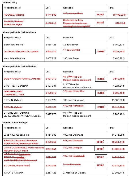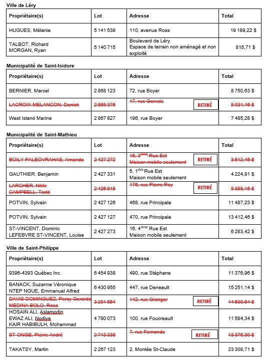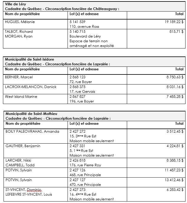 AVIS PUBLIC est, par la présente, donné par le soussigné, greffier-trésorier de la MRC de Roussillon, que les immeubles ci-après désignés seront vendus, sans aucune garantie, à l'enchère publique, au lieu où le Conseil de la MRC de Roussillon tient ses séances, 260B, rue Saint-Pierre, Saint-Constant, le jeudi 9 avril 2026 à 10 h, pour satisfaire au paiement des taxes municipales et scolaires comprenant les intérêts plus les frais encourus, à moins que ces taxes et frais ne soient payés avant la vente.